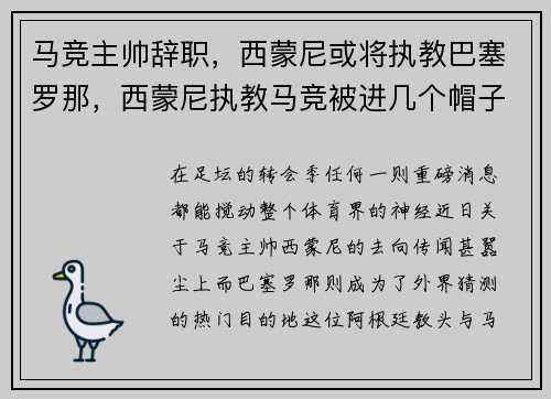 在足坛的转会季,任何一则重磅消息都能搅动整个体育界的神经。近日,关于马竞主帅西蒙尼的去向传闻甚嚣尘上,而巴塞罗那则成为了外界猜测的热门目的地。这位阿根廷教头与马竞的合同原本将在2024年到期,但双方关...